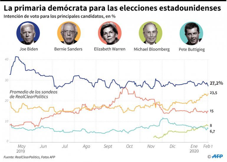 El senador por Vermont Bernie Sanders, quien se define como socialista, ostenta ventaja. Le siguen el exvicepresidente Joe Biden; el joven exalcalde de la ciudad de South Bend, Indiana, Pete Buttigieg; y la senadora por Massachusetts Elizabeth Warren.